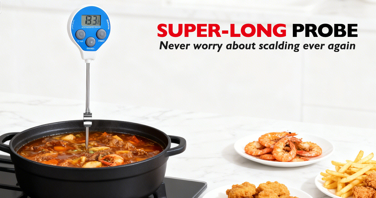 The TP511 features an advanced 8-inch probe that ensures precise measurements with an accuracy of ±0.5℃. As well, it has a programmable preset and alarm function that prevents overcooking, ensuring your candy is cooked to the correct stage. The pot clip helps keep the thermometer steady so you will not get accidentally burnt by splattering hot oil. Versatile and practical, this candy thermometer can also be used to measure other ingredients during the cooking process such as meats and other proteins.